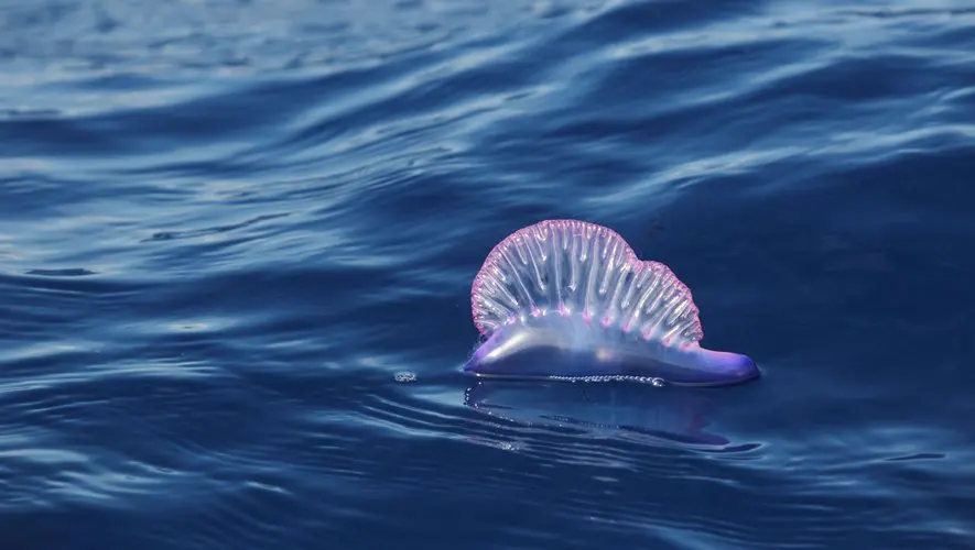 La galère portugaise, aussi connue sous le nom de Physalia physalis, n’est pas une méduse à proprement parler, mais un organisme colonial d’hydrozoaires. Elle se reconnaît facilement à sa vessie gazeuse flottante, souvent de couleur rose ou bleutée, qui lui permet de naviguer à la surface de l’eau. Ses tentacules, qui peuvent s’étendre sur une longueur impressionnante pouvant atteindre 20 mètres, sont chargés de cellules urticantes. Ces tentacules, souvent dissimulés sous la surface, sont la principale source de danger.